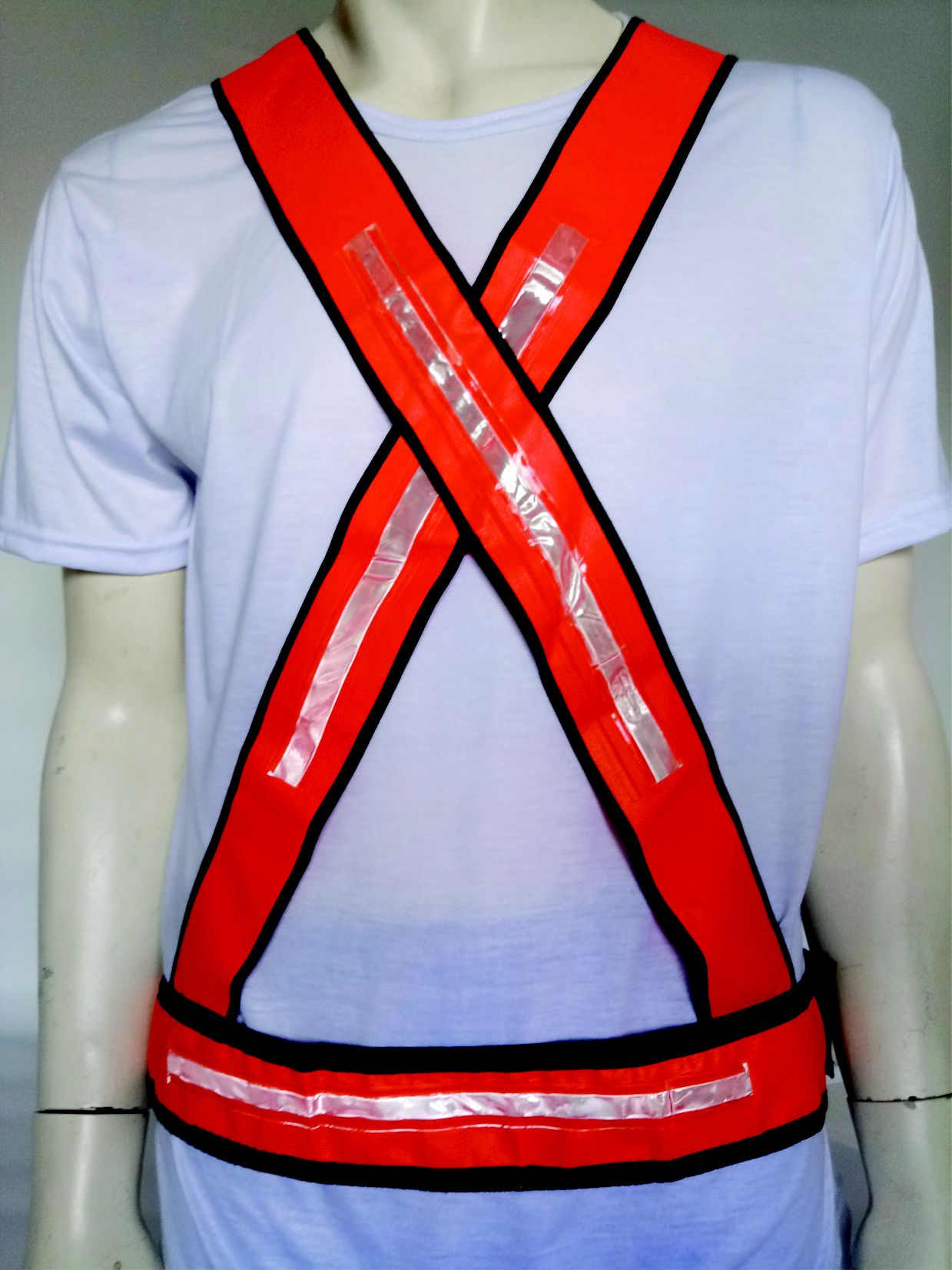 Colete refletivo tipo ‘X, confeccionado em pvc laranja ou verde, com fechamento em velcro para ajuste na cintura.